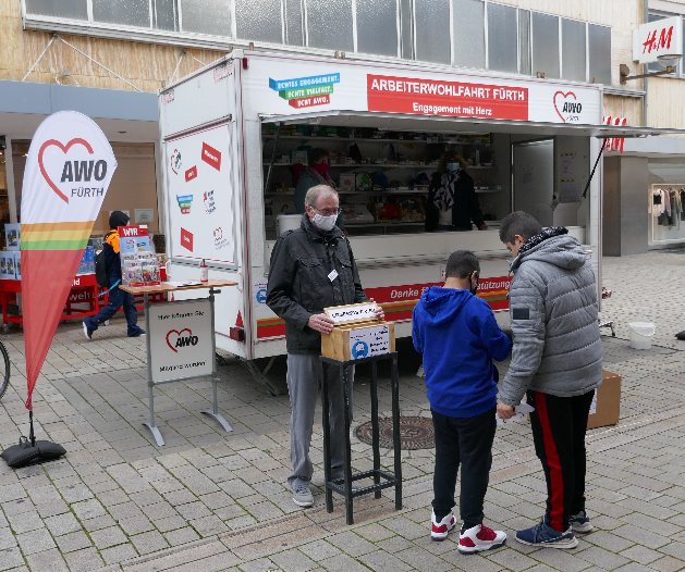 Die Arbeiterwohlfahrt (AWO) Fürth Stadt e. V. war mit seiner Glücksbude in der Fußgängerzone mit einem dreitägigen Losverkauf vertreten. Jeder der die soziale Arbeit und die Hilfsprojekte des Wohlfahrtsverbandes unterstützen möchte, konnte dort sein Glück versuchen. Viele ehrenamtliche Helfer der AWO engagierten sich aktiv an der Aktion – es war für sie im wahrsten Sinne des Wortes eine Herzensangelegenheit. Es wurden viele Lospreise im Vorfeld beschafft und natürlich fleißig Lose im Schichtbetrieb an die Fürther Bevölkerung verkauft.